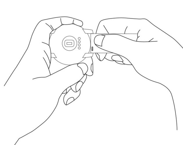 Press and hold the peg of the spring bar, then press in the opposite direction. Align the other peg with the hole on the inside of the other receptacle and release.
